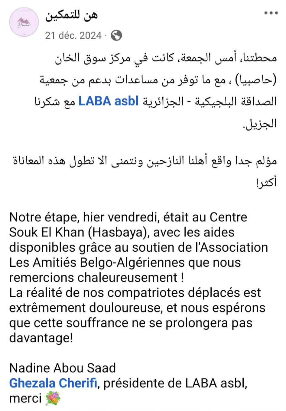 L’idée initiale était de faire une soirée qui aurait permis de financer les activités de l’association, nous avons beaucoup de dépenses qu’il faut assurer, mais l’actualité au Moyen-Orient ne peut nous laisser insensible. Nous avons décidé de faire don des bénéfices de la soirée à une association libanaise « Hounna /Elles for empowerment » créé par Noura Amer dont voici le message de remerciement :